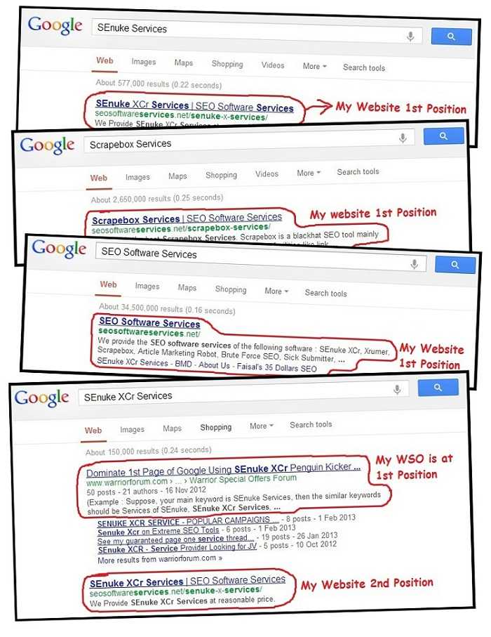 Well, search with the keywords Scrapebox Services, SEnuke Services, SEnuke X Service, SEnuke X Services, SEnuke XCr Services, SEnuke XCr Service, SEnuke TNG Services. These are competitive keywords and my site www.seosoftwareservices.net is on first page of Google for these keywords. Do you need any other proof ??? Please see the ranking of my site (www.seosoftwareservices.net) :
